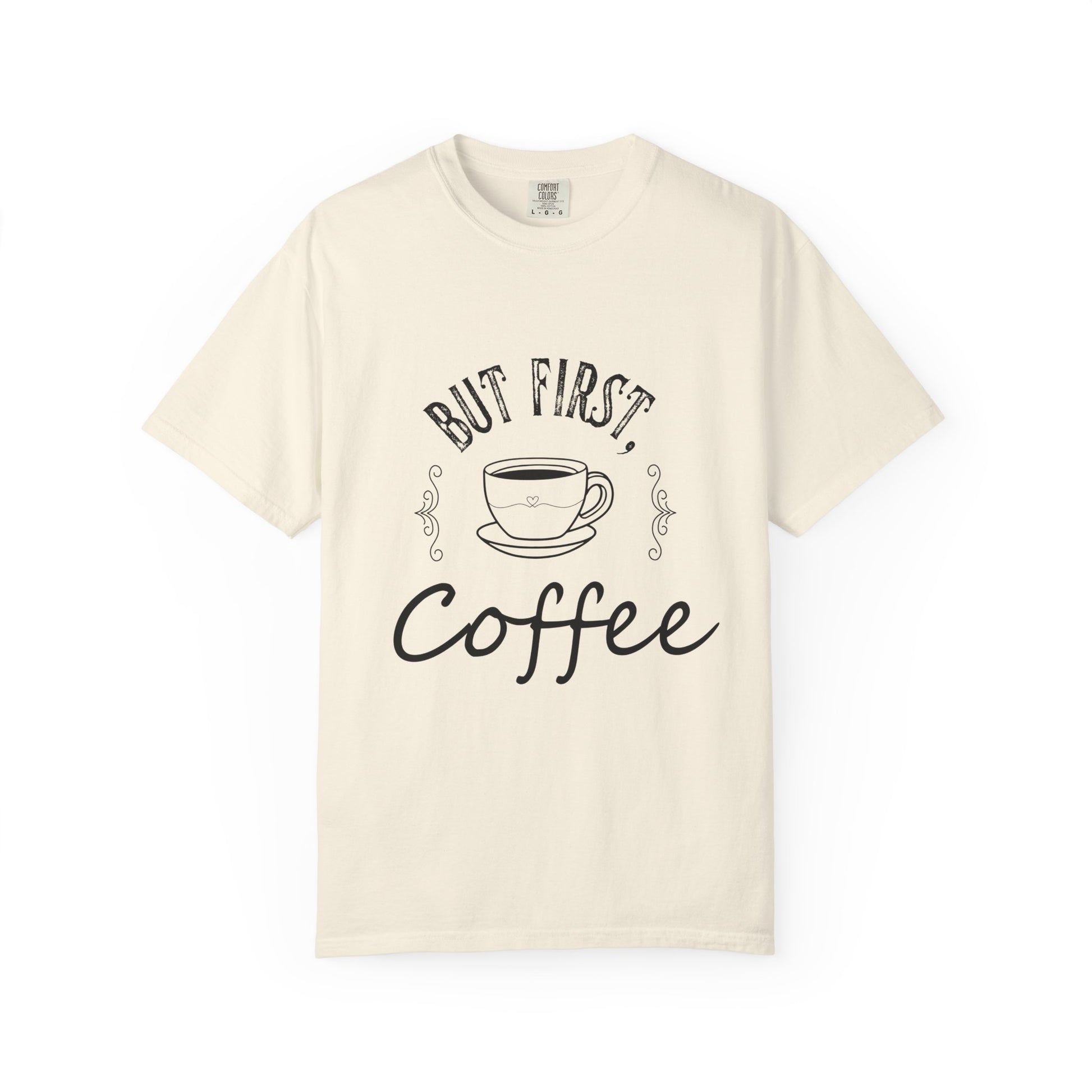 A comfortable and stylish unisex garment-dyed T-shirt with the phrase 'but first, coffee' printed on it. Perfect for coffee lovers who want to showcase their love for caffeine. This tee is great for casual everyday wear or as a gift for coffee enthusiasts on birthdays, holidays, or any occasion.