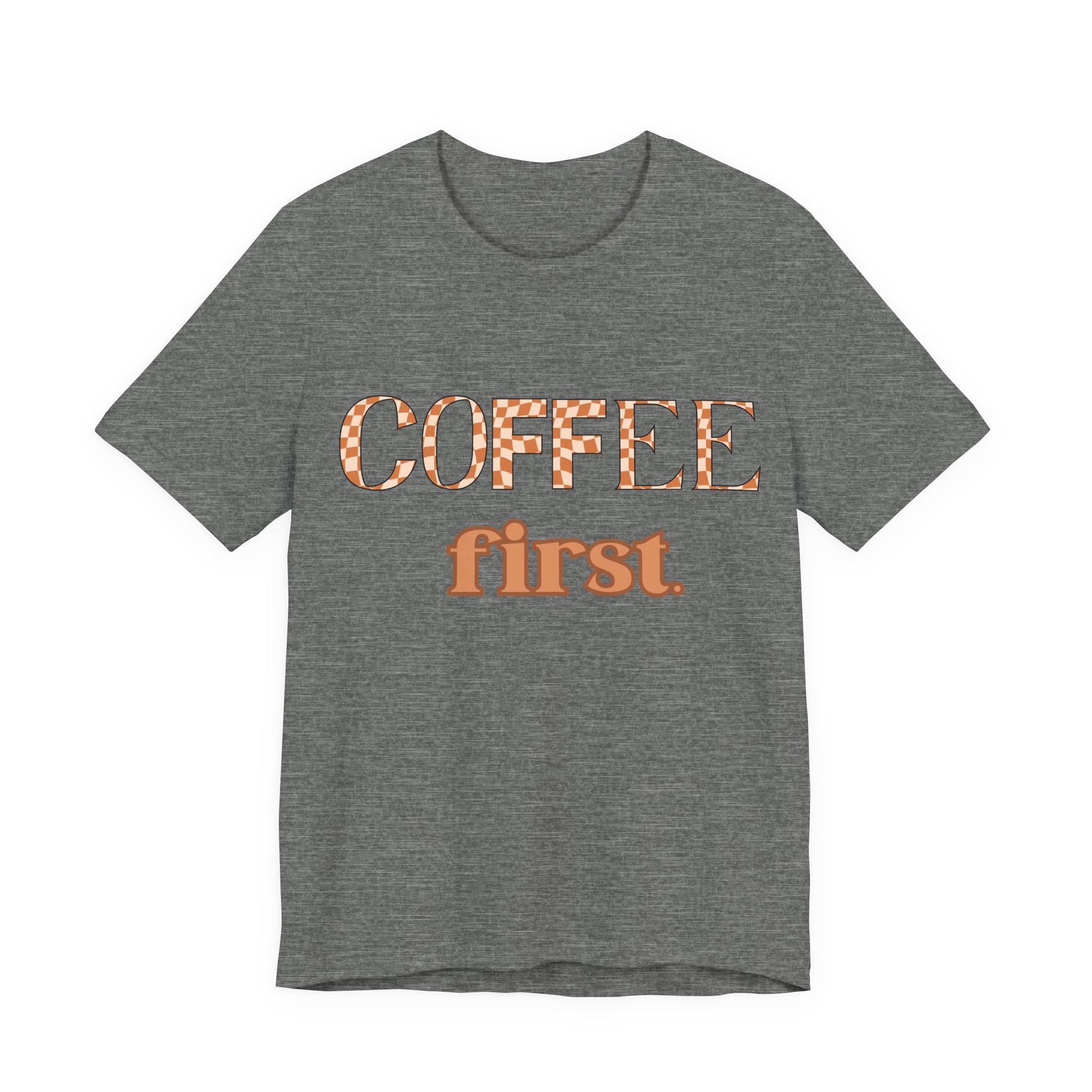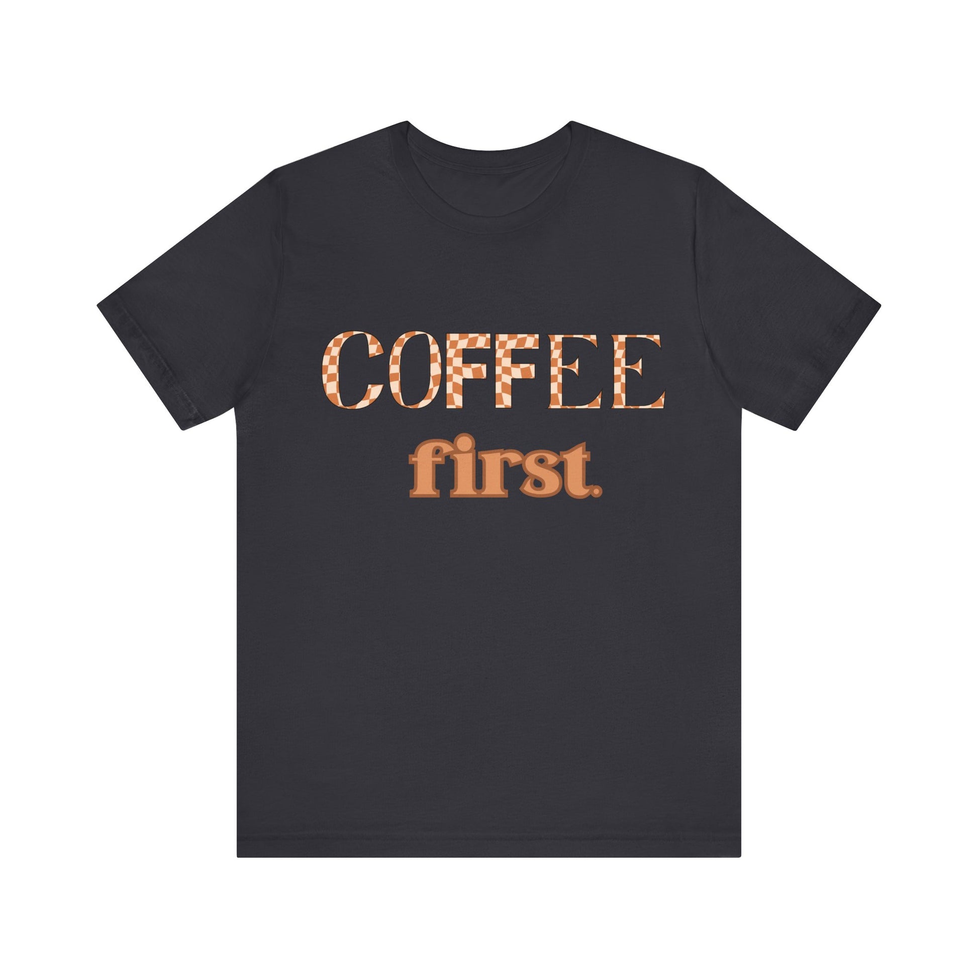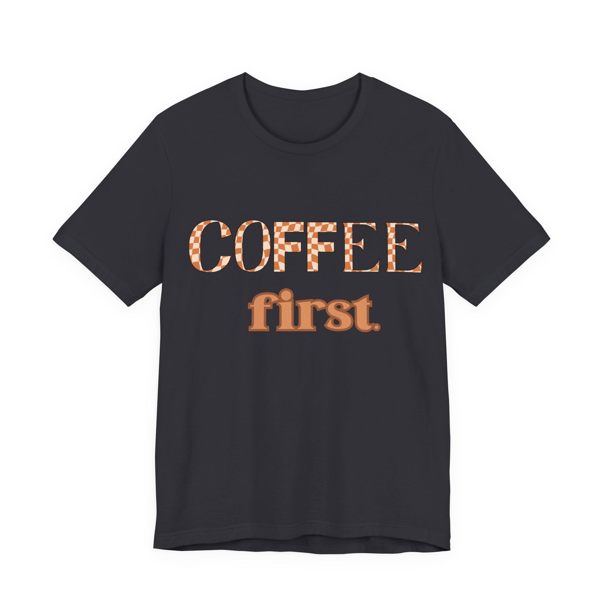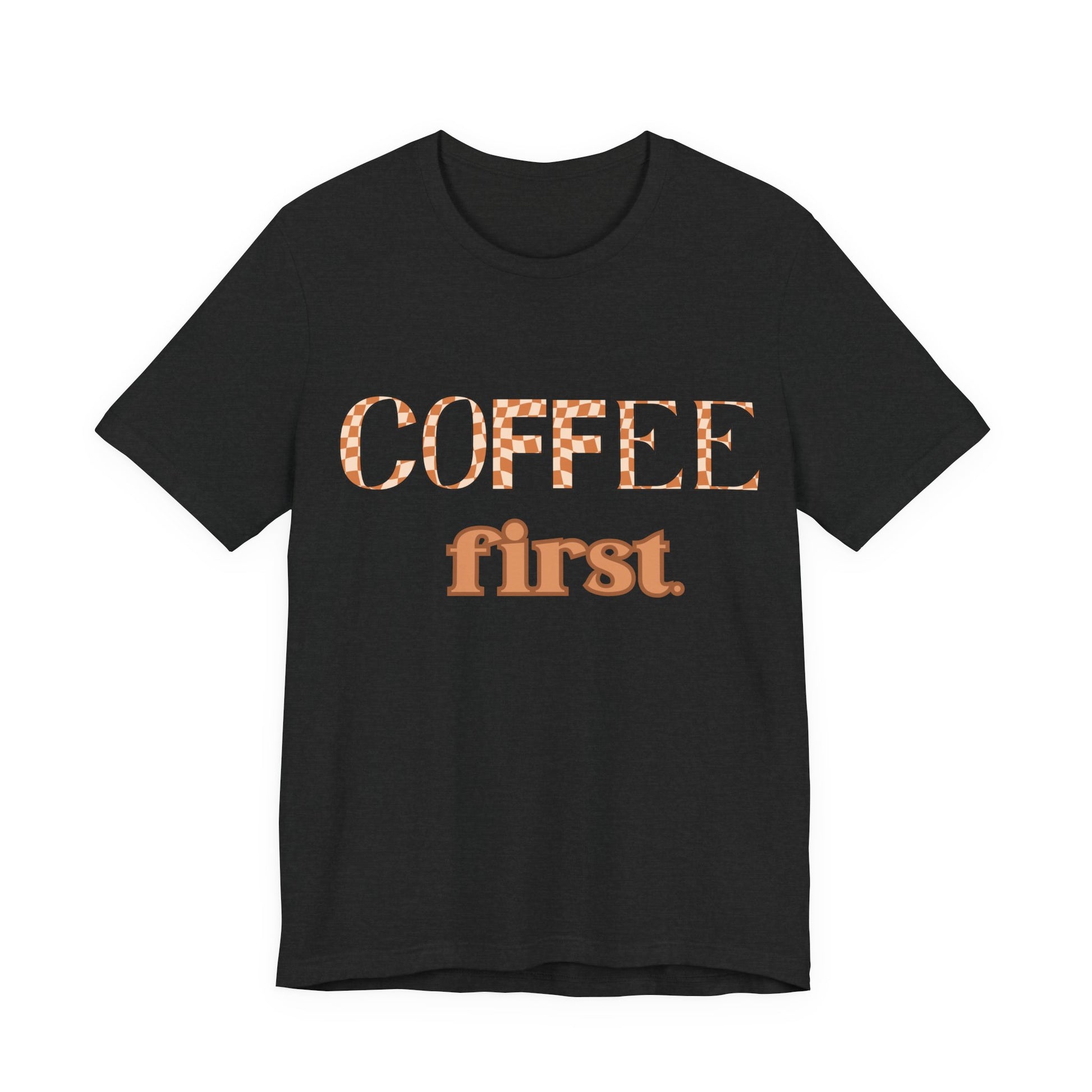 Coffee First T‑Shirt — Retro Checker & Script Coffee Lovers Tee