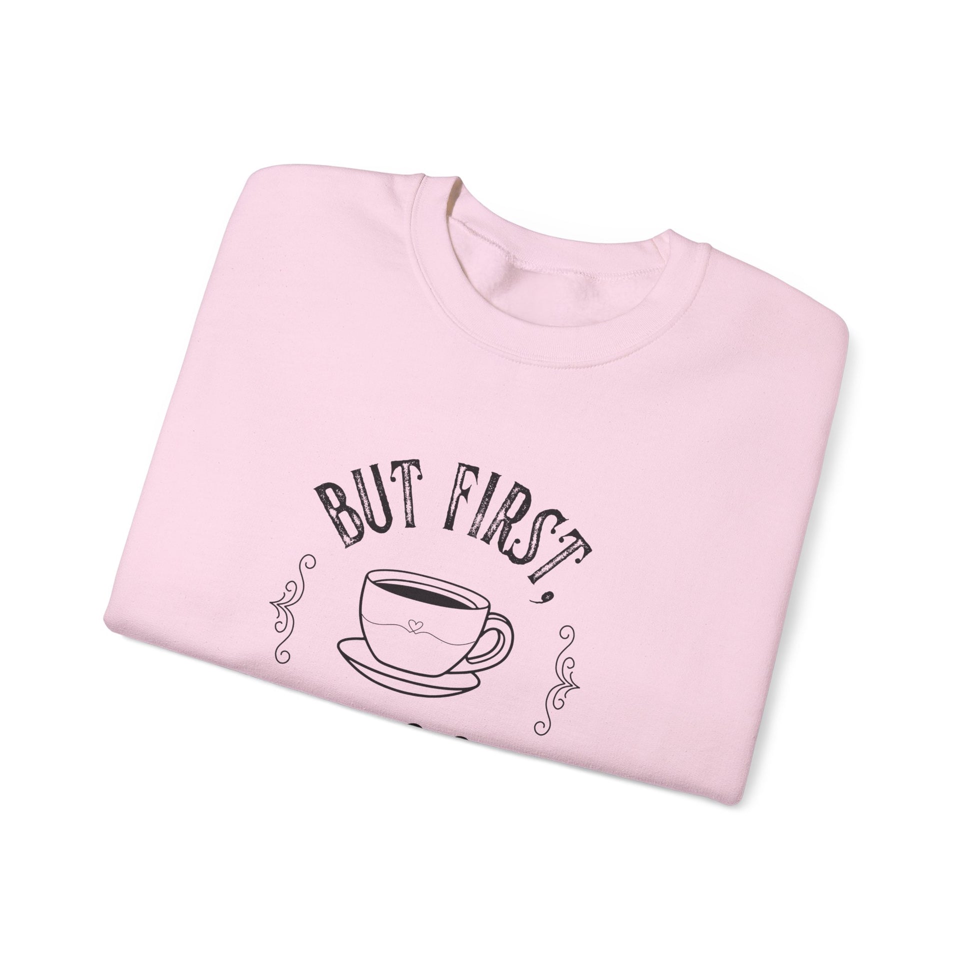 Stay cozy and stylish with this unisex Heavy Blend™ Crewneck Sweatshirt featuring a humorous "But first, coffee" design. Perfect for coffee lovers who enjoy a good laugh while staying warm.