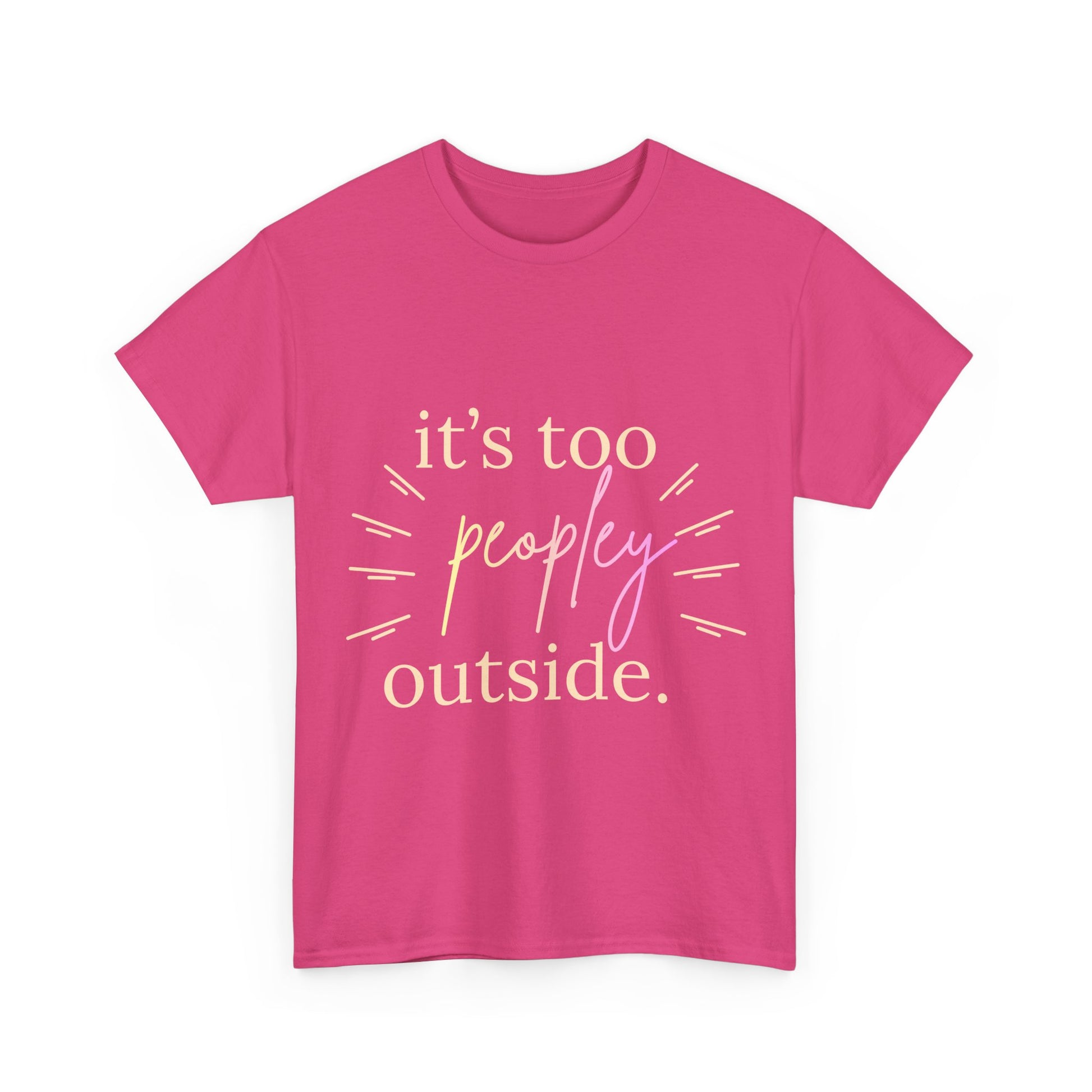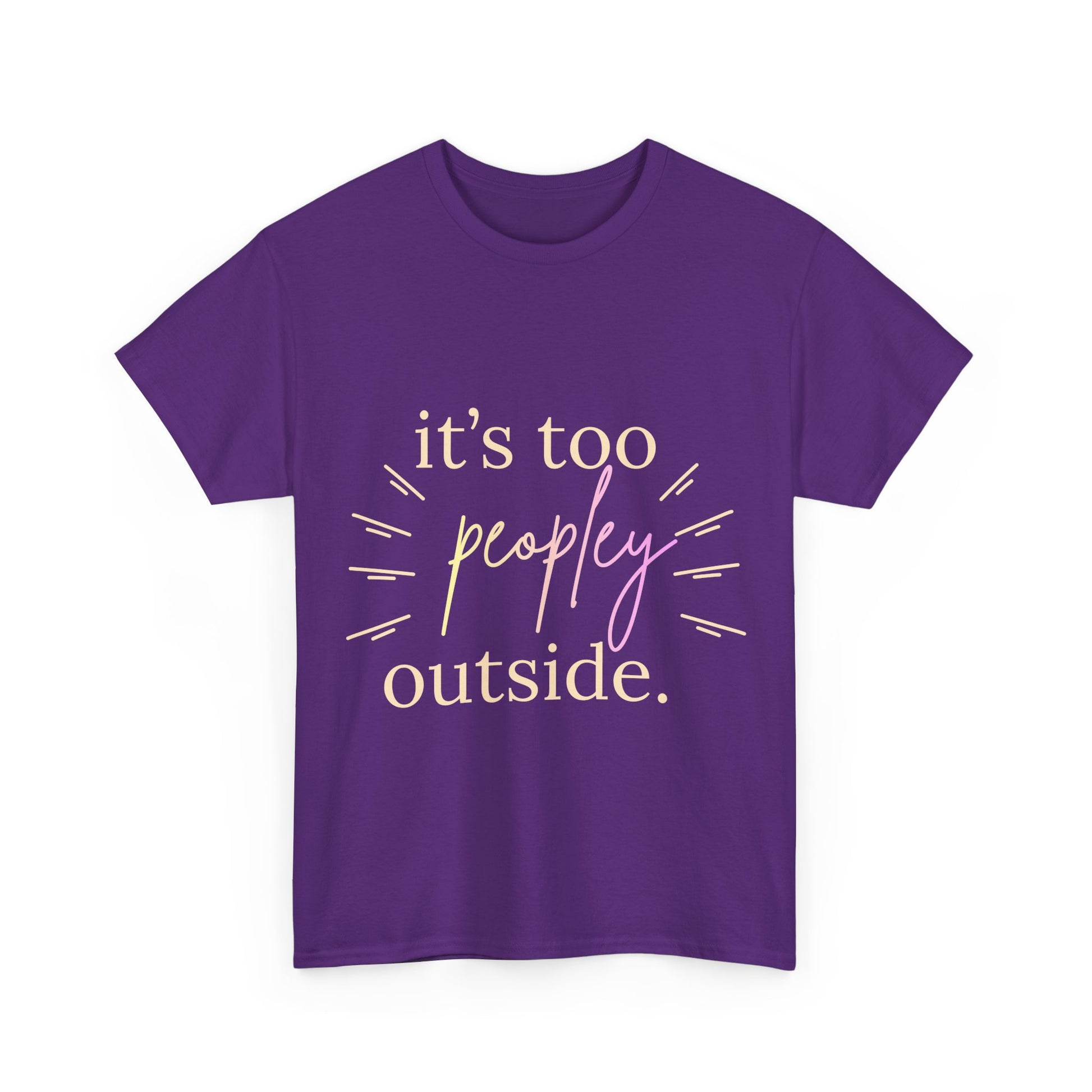 Soft, relaxed, and a little sassy — this classic tee says it all with a warm, handwritten script: “it’s too peopley outside.” Lightweight but sturdy, it drapes easily for laid-back days when staying in feels like the best plan. The muted gold and lilac lettering plus subtle radiating marks give it a cozy, slightly vintage feel that pairs with jeans, lounge pants, or your favorite cardigan. Wear it on a quiet morning with coffee, to a small dinner with close friends, or while curled up reading — it’s the kind of shirt that speaks to introverted humor and slow, intentional moments.